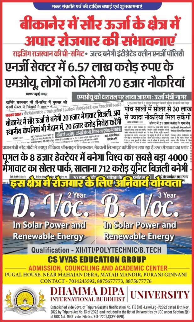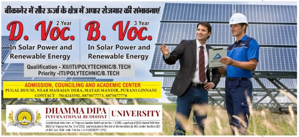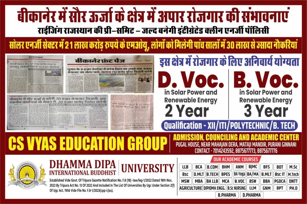 CS Vyas Education Group is a leading institute in Western Rajasthan offering B.Voc and D.Voc courses in Solar Power and Renewable Energy. Our mission is to equip youth and professionals with the skills required for India’s clean energy revolution. CS VYAS EDUCATION GROUP is a leader in higher education, Vocational and Skill-based education and collaborated with Dhamma Deepa International Buddhist University.
